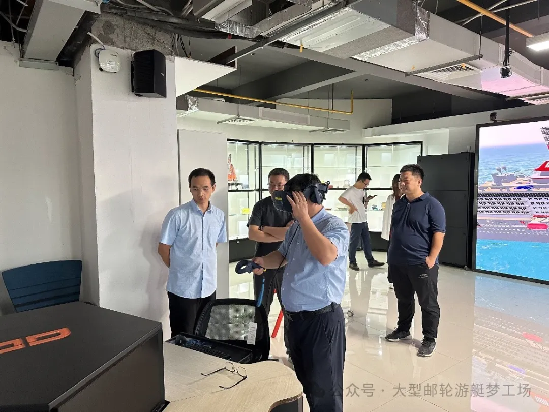随后,曾青松场长结合梦工场的邮轮游艇模型,详细讲解了邮轮游艇的设计细节,来访领导通过亲身体验VR设备,身临其境的感受邮轮游艇领域的研究新方法。
