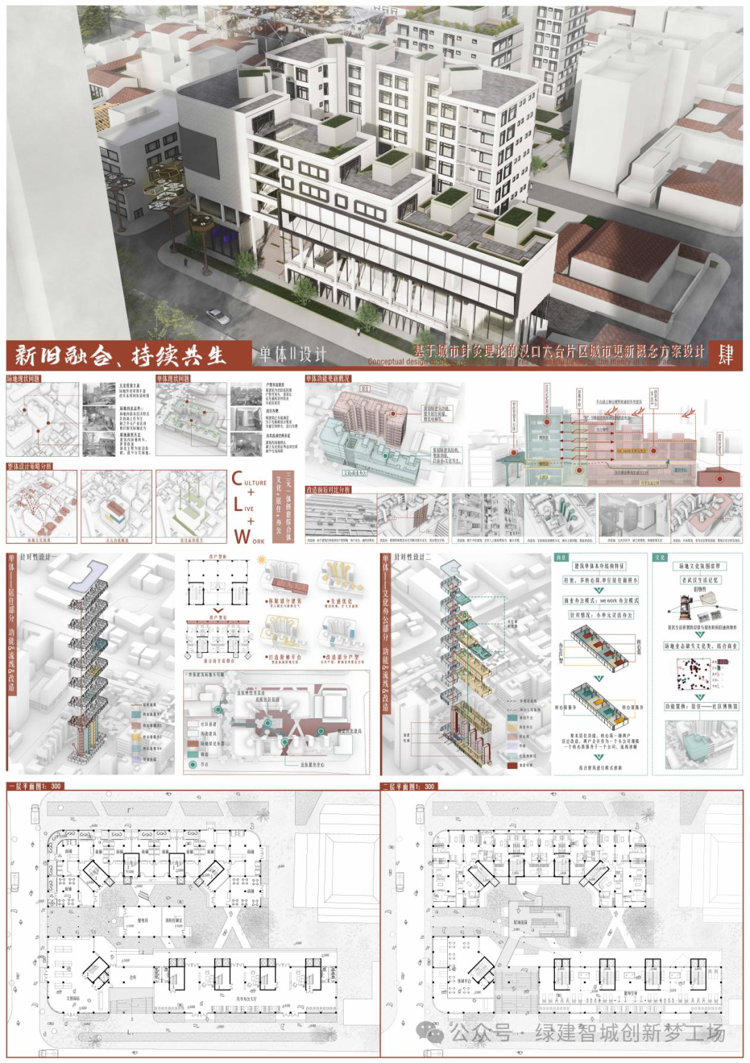 ②文化-办公-居住综合体:虑到整个场地业态单一,活力不足,场地本身具有丰富的文化资源,却未得到有效的利用,对其进行重新的设计定位,提出“文化+居住+办公”的多元融合设计方案。采取三个主要设计策略,一是场地文化展现,通过开放退台设置社区博物馆等方式,满足场地文化配套需求,二寻求多元的功能赋能,结合原本居住建筑多核心筒、建立墙问题,参考we work的商业模式,置入小单元灵活办公空间,打造CLW创意综合中心。三是针对本身居住环境进行优化提升,通过开放屋顶露天,增加公共和景观空间,改善户型的手法,提升居住环境品质。