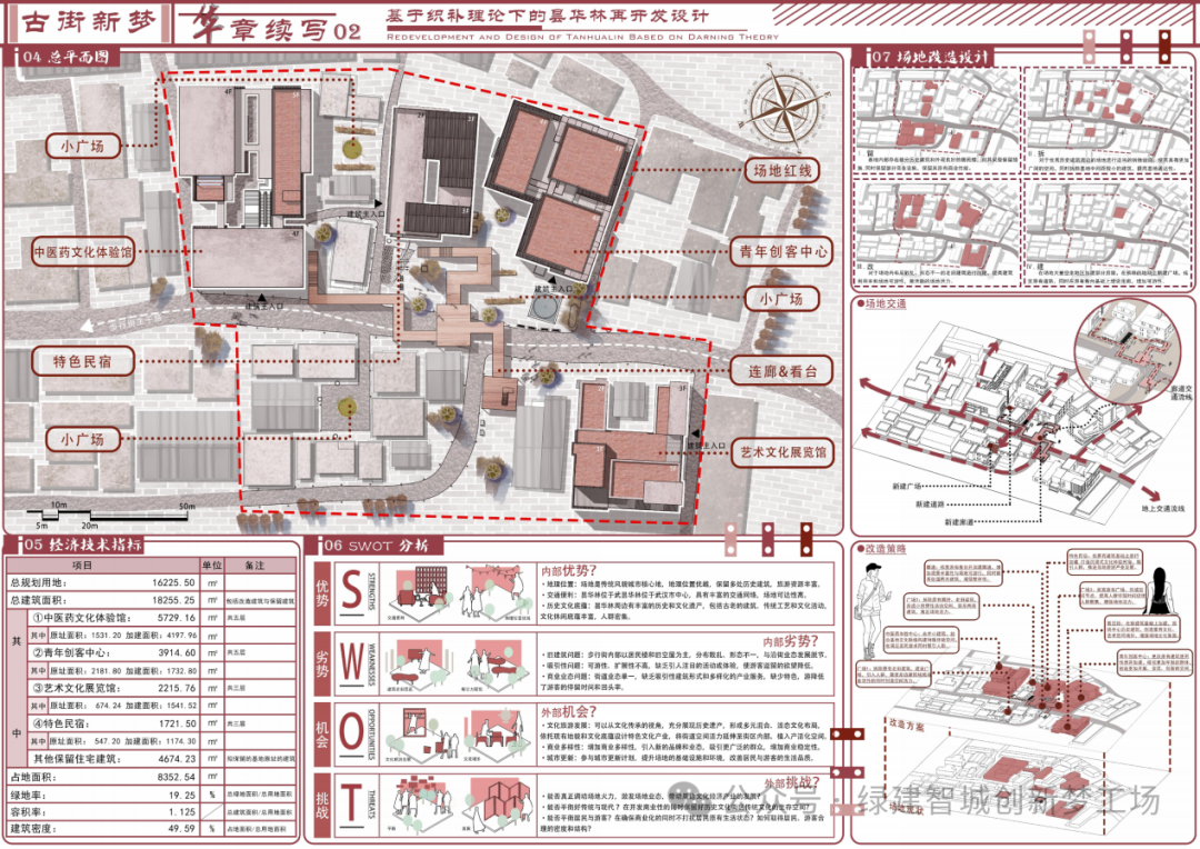 场地规划:以“织补理论”为依据,通过“留、拆、改、建”四步进行。留下基地内的历史建筑和较好的居民楼,拆除基地中间距较小的建筑,提高场地通达性,改建场地内布局散乱、形态不一的老旧建筑,在场地空余地区适当加建房屋和构筑物,活化地块。