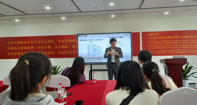 最后,在盛隆大厦会议室,袁经理对盛隆的企业模式进行了更为深入的介绍,讲述了盛隆的企业文化与模式特色。期间,袁经理与员工展开友好互动,为师生答疑解惑。彭经理从“大气、大爱、大成”三个方面对盛隆的创业模式进行了评价,并鼓励同学们要继续加强实践学习,拓宽视野,增长本领。