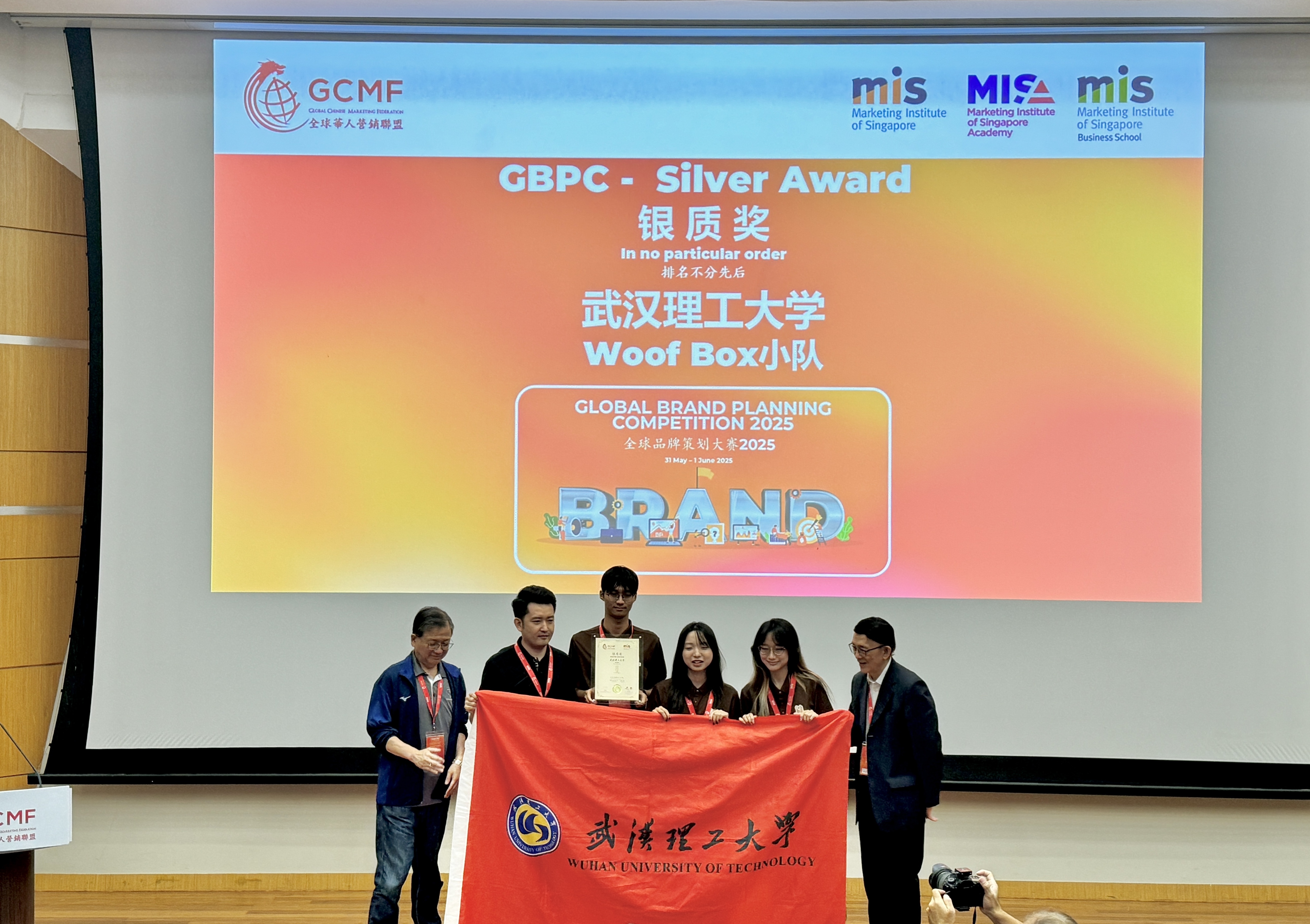 On June 1st, the 2025 China University Business Elite Challenge (Singapore)- Global Brand Planning Competition, jointly organized by the Global Chinese Marketing Federation (GCMF) and China Council for the Promotion of International Trade Commercial Sub-Council, concluded at Singapore Management University. 21 teams from 18 universities across China, Singapore, the Philippines, Thailand, and other countries and regions engaged in fierce competition. The Woof Box team, composed of Chen Xuefei, Zhan Ruihan, Mei Zihan, Yang Ziqing, Li Yuehang, and others, under the guidance of Mr. Han Shaoqin from the School of Entrepreneurship of our University, won the Silver Award in the global final with outstanding performance.
