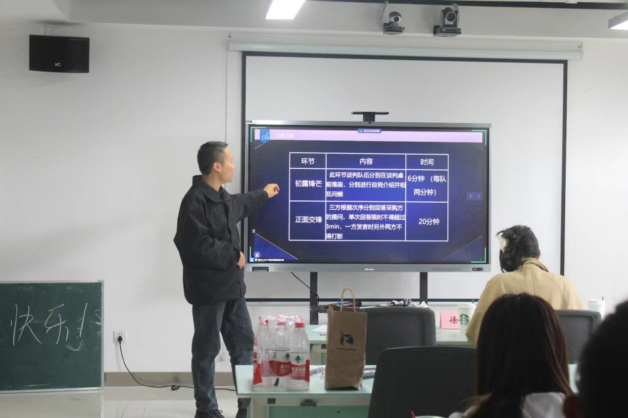紧接着,培训大会正式拉开帷幕。第一个环节由必威西汉姆联官网的张之剑老师担任主讲嘉宾。张老师详细讲解了模拟商务谈判的规则、比赛流程以及比赛要求等内容。他强调,商务谈判不仅是一场智力较量,更是一场团队协作和沟通技巧的考验。选手们听得津津有味,不时点头表示赞同。