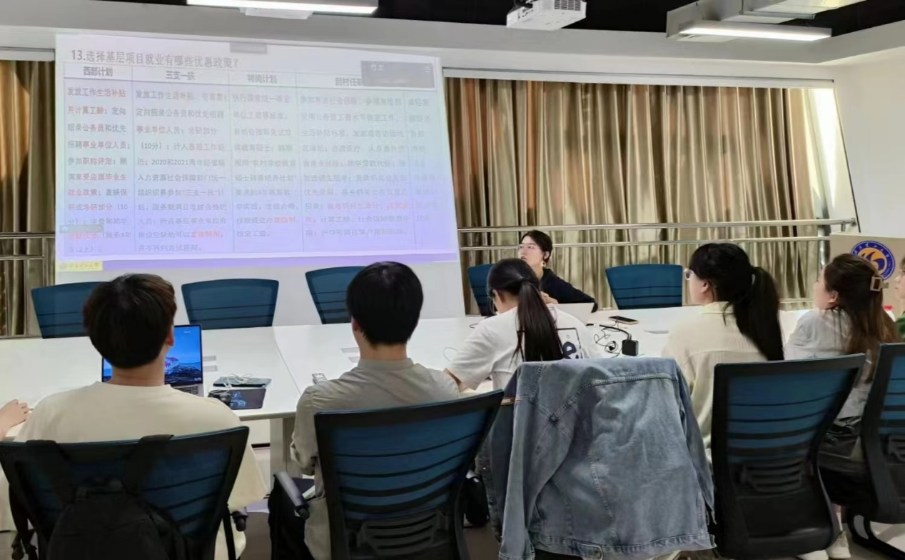 在会议中,贾老师结合当前的研究生就业现状和企业招聘趋势,从就业协议的签署、个人材料交接以及毕业去向等方面展开详细的介绍。她建议同学们在面对就业时,要正确判断就业形势和自身条件,尽早明确就业方向,诚信就业,并就同学们在求职过程中的困惑进行解答。